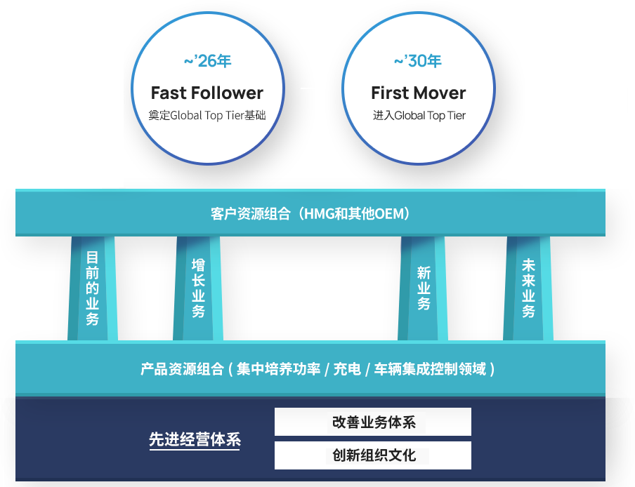 고객 포트폴리오(HMG 외 타 OEM), 현사업, 성장사업, 신규사업, 미래사업, 제품포트폴리오(전동이륜차, AI, 클라우드 데이터 서비스 등으로 확대 中), 엄무체계 선진화와 조직문화 혁신
