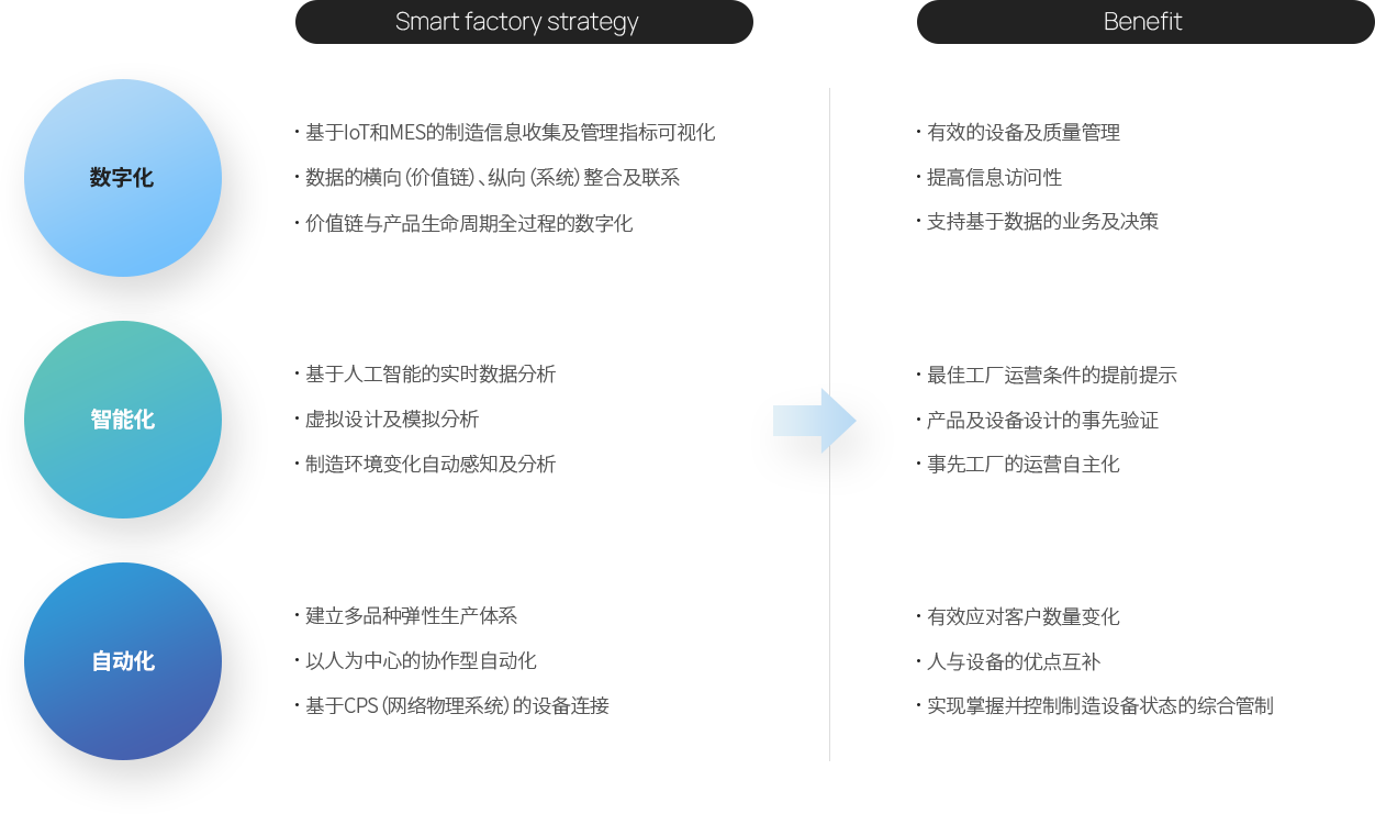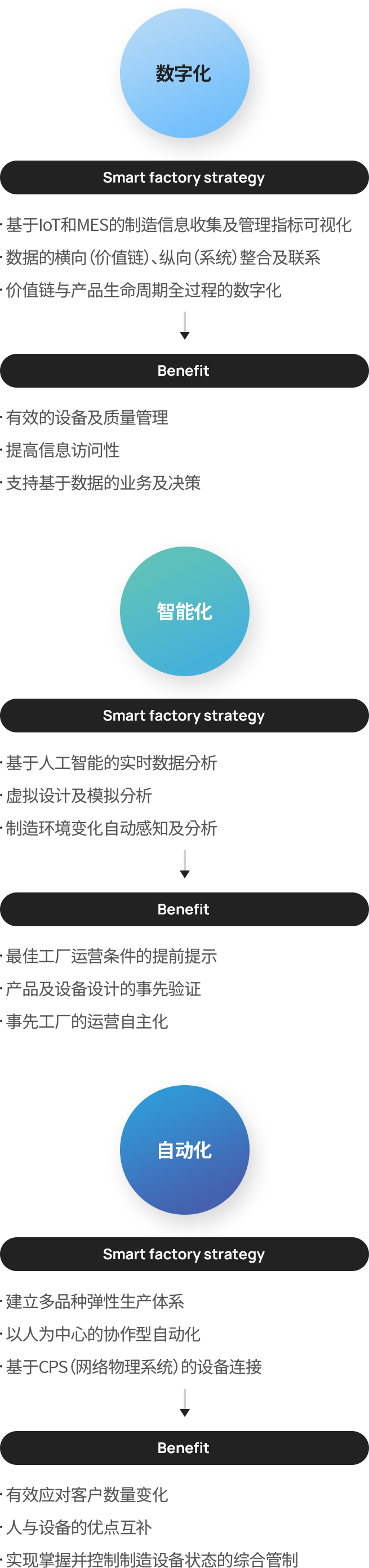 现代凯菲克计划通过基于累积知识和经验的产品/制造整合数字化、基于数据的工厂/设备控制智能化、 基于生产运营效率化的制造工艺及物流自动化这3个智能工厂战略实现智能型弹性工厂。